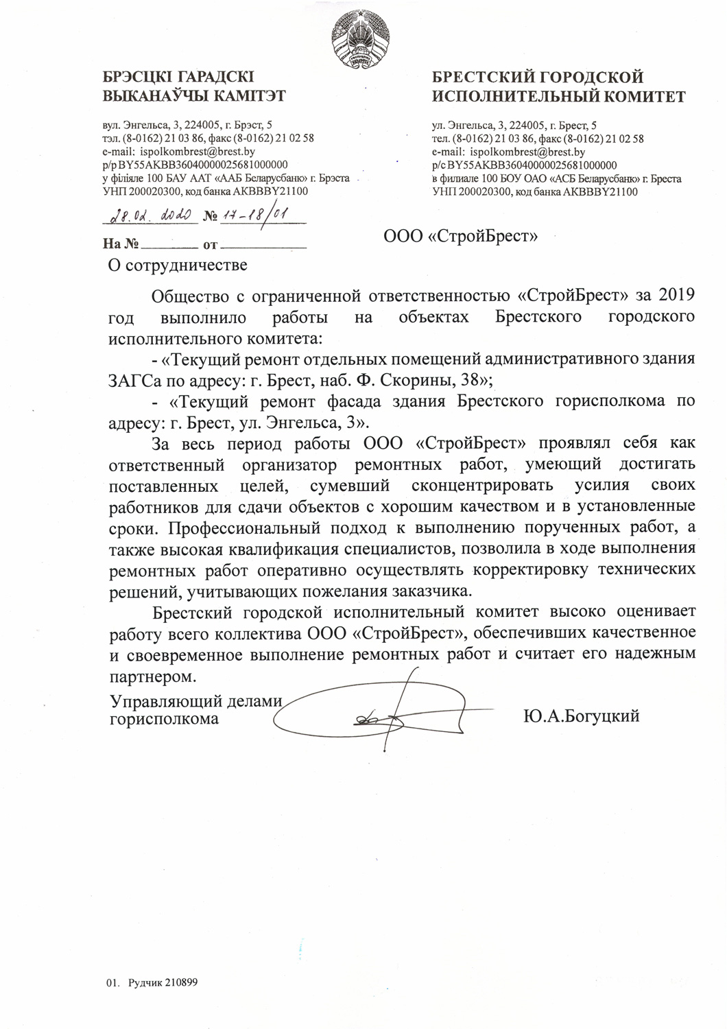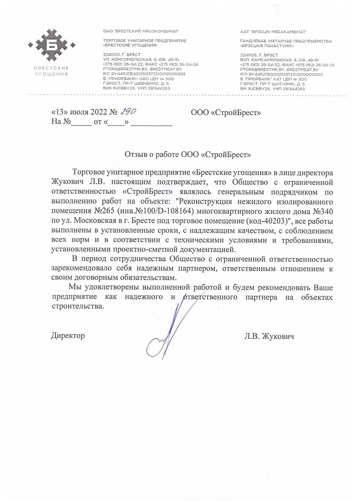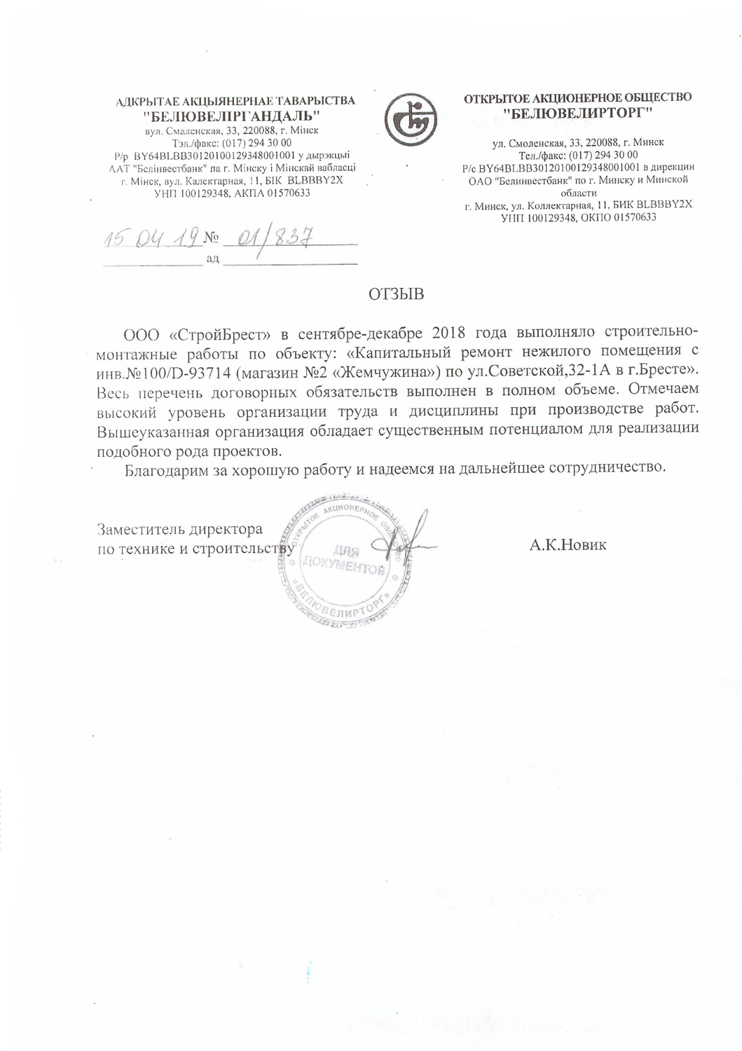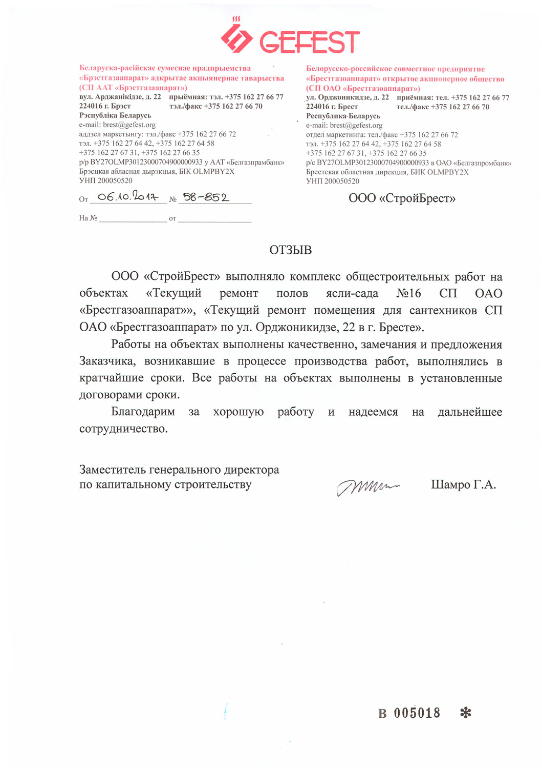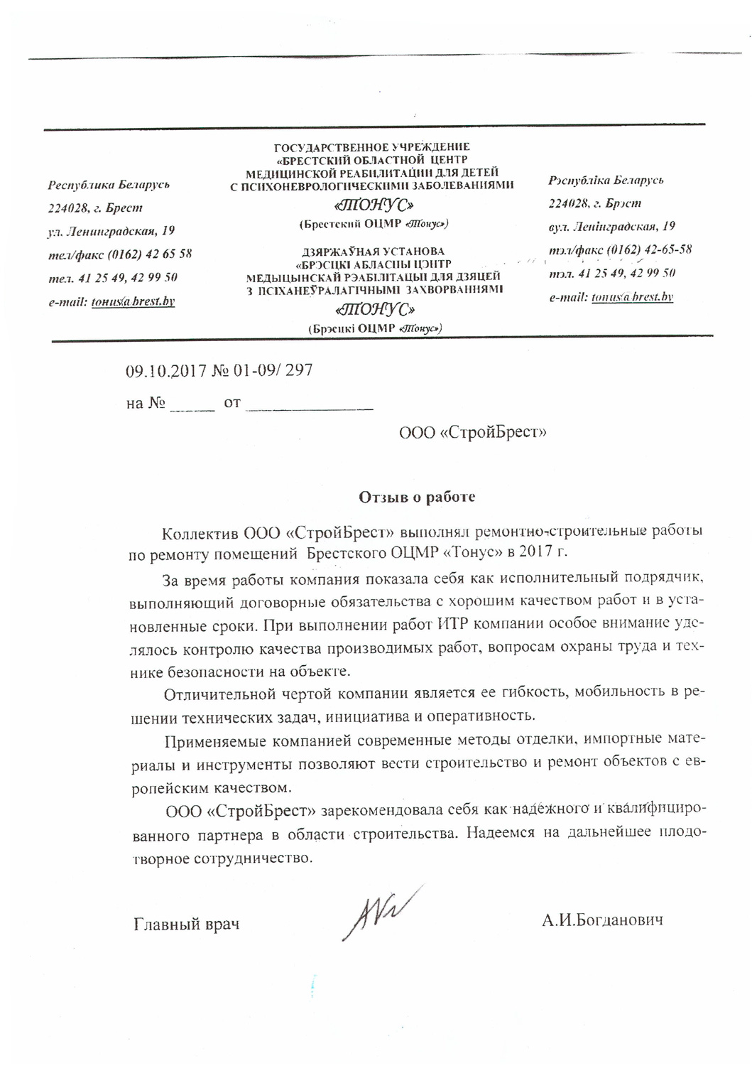 Мы стремимся стать лучше, поэтому собираем информацию о качестве предоставляемых нами услуг. Если Вы ранее уже работали с нами, то просим Вас оценить нашу работу. Это можно сделать направив письменный отзыв о нашей работе в произвольной форме на ooosbrest@gmail.com, либо, в соответствии с требованиями системы менеджмента качества, в представленной по данной ссылке форме: https://forms.gle/oKfMzkgSzCzZXUU77